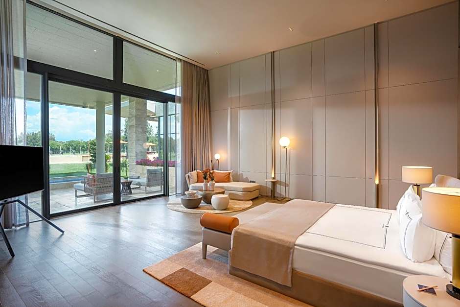 This villa has a terrace with seating and sunbathing area. Guests can enjoy the Golf Course view. There are three bedrooms, a living room with kitchen, three toilets, three private bathrooms, a spa bath, a baby sitter room and a gazebo near the villa. A private outdoor swimming pool is offered.