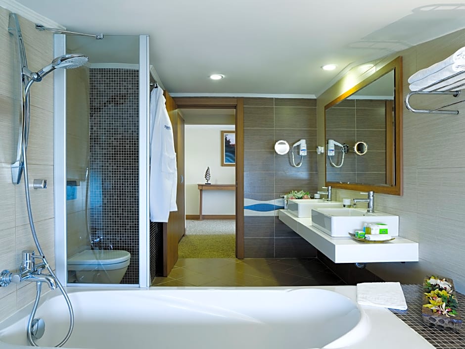To top it all off, Sueno Hotels Golf Belek - Free Access to Sueno Hotels Deluxe Belek Facilities offers comfortable and well-equipped rooms with free Wi-Fi, air conditioning, and private balconies offering stunning views. The attentive staff, 24-hour front desk, and provided shuttle service ensure that guests' needs are met throughout their stay. With all these features and more, this resort is the perfect destination for a relaxing and fun-filled vacation in Turkey.