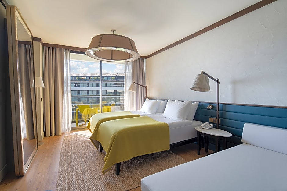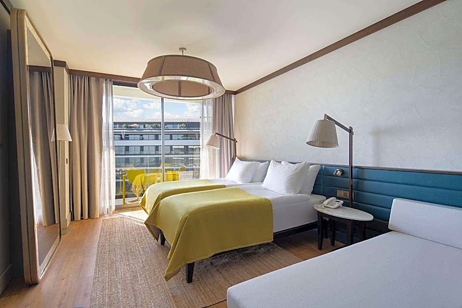 TRIPLE MAIN BUILDING SIDE SEA VIEW is 344 square feet and includes either 2 single beds 80-130 width or a queen-size bed 150-154 width plus a sofa bed plus balcony, terrace, satellite tv , hairdryer, safe, bathrobes, and slippers and is Wheelchair-accessible.