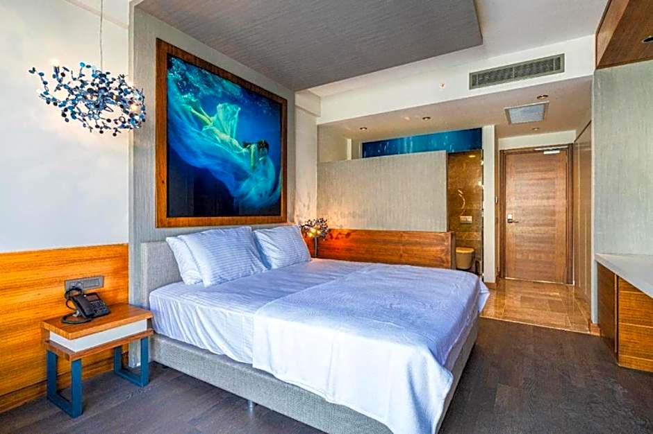 This is a modern hotel, well positioned on the seafront in the middle of Bodrum. There is a very pleasing modern design all through the hotel. The staff are friendly and helpful. The queen room on the ground floor, with pool access and a really nice outdoor deck was bright and warm.