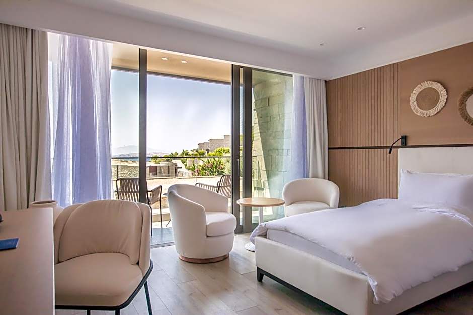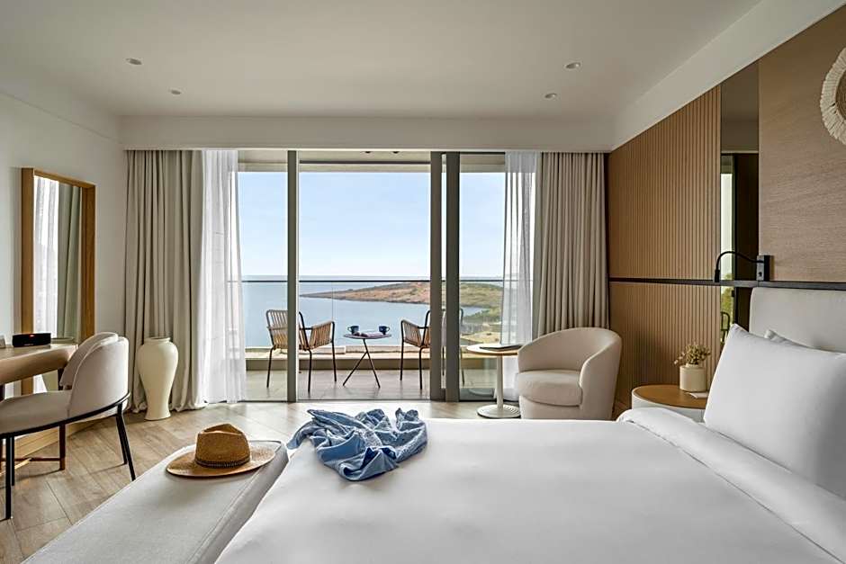 Facing the Aegean Sea, the 43sqm Deluxe Partial Sea View rooms are equipped with a comfortable double bed suitable for 2 adults. The private balcony offers a lot of sun-filled space for you to relax in the privacy of your room. The design is characterized by shades of blue and earthy color touches with hand-picked accessories to ensure a cozy and comforting atmosphere.