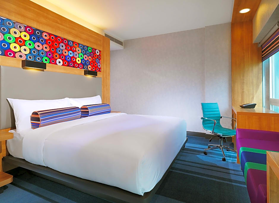 The hotel offers a variety of room types including the Aloft King Guest Room with a king-size bed, the Aloft Twin Guest Room with two twin beds, and the Savvy Larger Guest Room with a spacious 441 sqft layout and a king-size bed. All rooms accommodate 2 adults and 1 child, and smoking is not allowed in any of the rooms.
