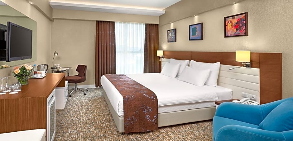 The Merlot Hotel Eskisehir offers King Suites with a room size of 700 sqft for single occupancy, accommodating 3 adults with a sofa bed and a King size bed. Additionally, there are Business Double or Twin Rooms and Standard Double or Twin Rooms with 301 sqft room size, accommodating 2 adults and 1 child each, featuring King size beds and no smoking allowed.