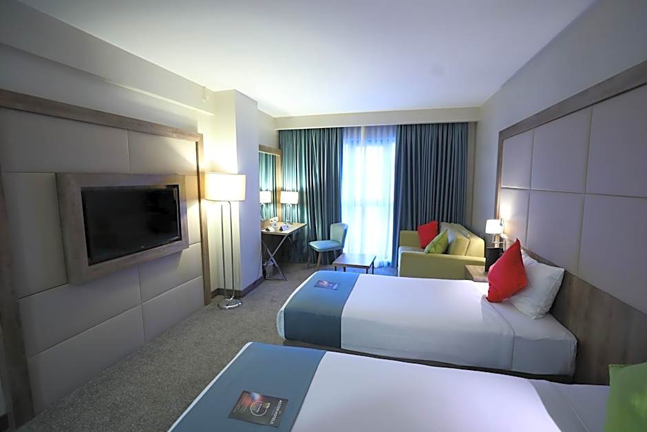 The spacious air-conditioned double room offers a flat-screen TV with satellite channels, soundproof walls, a mini-bar, a tea and coffee maker as well as city views. The unit offers 2 beds.