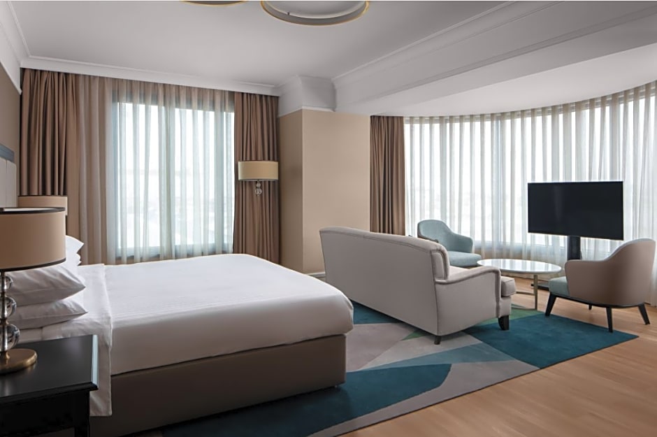 The Istanbul Marriott Hotel Pendik offers a variety of room types including King Rooms with Sea View, Suites with Two Queen Beds and Sea View, Junior King Suites with Sea View, Superior Twin Rooms with Sea View, Superior King Rooms with Sea View, Deluxe King Rooms with City View, and Deluxe Twin Rooms with City View. All rooms are non-smoking and can accommodate 2 adults and 1 child. Bed sizes range from King to Twin.