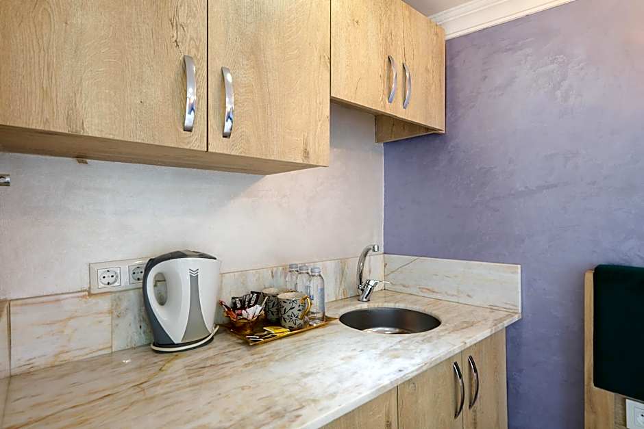 No dishes in the room, only two cups—no plates, forks, or spoons. We bought disposable ones. There is a kettle, but no electric stove. No elevator, only a spiral staircase up to the 5th floor. But it is normal for Istanbul hotels. Note that the room with the terrace is on the top floor.