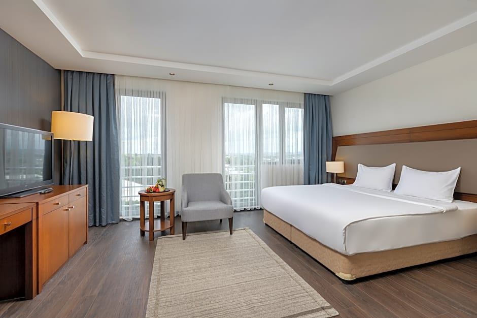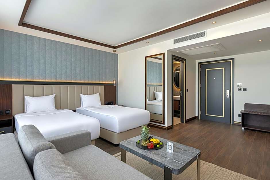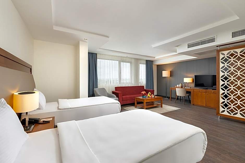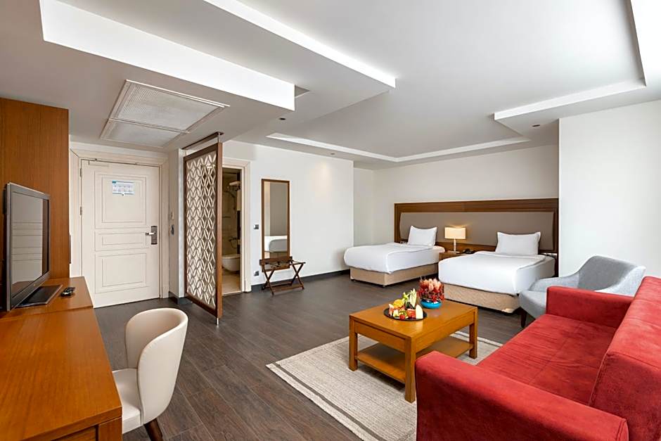 The Miracle Istanbul Asia Airport Hotel & Spa offers a range of room types to accommodate different needs. The rooms include Business Double Rooms with Gym Access, Superior Double or Twin Rooms, Premium Superior Rooms, Premium Suite Rooms, Premium Deluxe Rooms, Suites, Family Suites, Deluxe Double or Twin Rooms, Junior King Suites, and Premium Business Executive Rooms. Smoking is not allowed in any of the rooms. The room sizes range from 301 sqft to 1668 sqft and can accommodate varying numbers of adults and children. Bed sizes include King size beds and Twin beds.