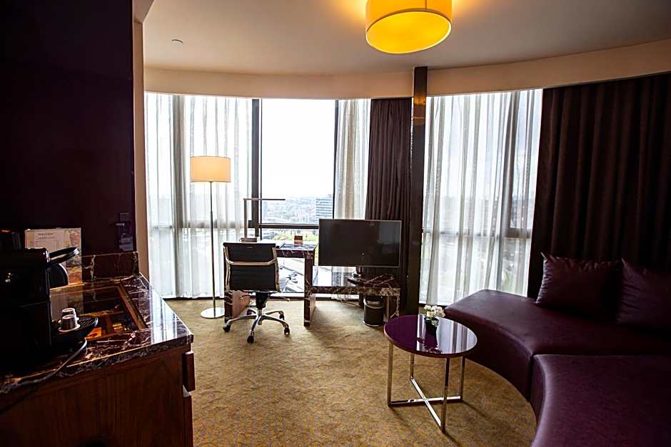 The hotel offers several types of rooms including Executive Suites with Separate Living Room, Deluxe King Rooms, Panoramic Corner Double Rooms, Superior Twin Rooms, Family Connecting Rooms, Deluxe Twin Rooms, Junior Suites with Separate Living Room, and Superior King Rooms. Smoking is not allowed in any of the rooms. The rooms accommodate 2 adults and 1 child. The bed sizes vary, with options including King size beds, Double beds, Twin beds, and Queen size beds depending on the room type.
