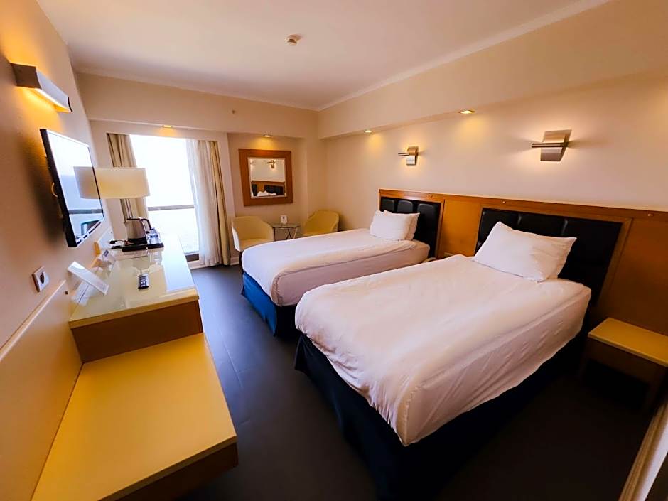 Room choices cover a wide range, from Standard and Deluxe to suites, with several variants offering sea views. Options include Deluxe with City View, Deluxe with Sea View, Deluxe King, and King Room, as well as Twin and Double configurations, plus Suite Premium (with and without sea view). Some suites can accommodate up to 8 adults and 5 children. Payment is convenient with JCB, Visa, Mastercard, and American Express accepted; cash is not accepted.
