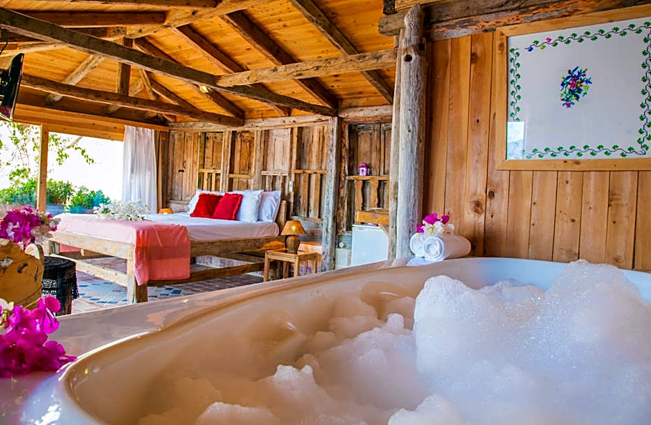 Located on the top floor, it has picturesque views of the Mediterranean Sea. Includes a spa bath. These two rooms are 45 sqm each and boast breathtaking views of the sea from Fidanka’s highest point. Boasting double windows and built with centuries old cedar timbers from nearby villages, guests are sure to be amazed at the Mediterranean’s blue and Kalkan’s lights from these rooms’ hot tubs and terraces. Both rooms have private entrances, extensive sea and pool views, and a private seating area.