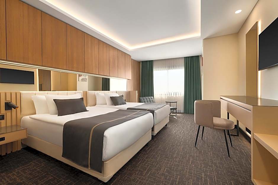 Our well-appointed non-smoking Standard Twin Room features 2 single beds with comfortable linens, a balcony with city views, coffee/tea maker, kettle, and minibar. Modern essentials like free WiFi and a flat-screen TV keep you connected while extras like complimentary bath products, a hair dryer, bathrobes, and slippers help you unwind. Additional amenities in this 25-square-meter retreat include a safe, desk, ironing amenities, clothes press, prayer mats, air conditioning, and bottled water.