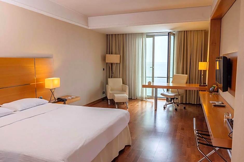 This spacious corner suite includes a bedroom, living room and a bathroom. It offers sea views.