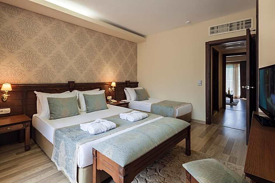 Step into a world of relaxation and fun with free access to the water park, indoor and outdoor swimming pools, Turkish/Steam Bath, sauna, and fitness center included in your stay. The hotel also boasts a private beach area, water sports facilities, tennis court, and mini-golf for those craving some outdoor excitement. For the little ones, there's a kids' club and kid-friendly buffet to keep them entertained.