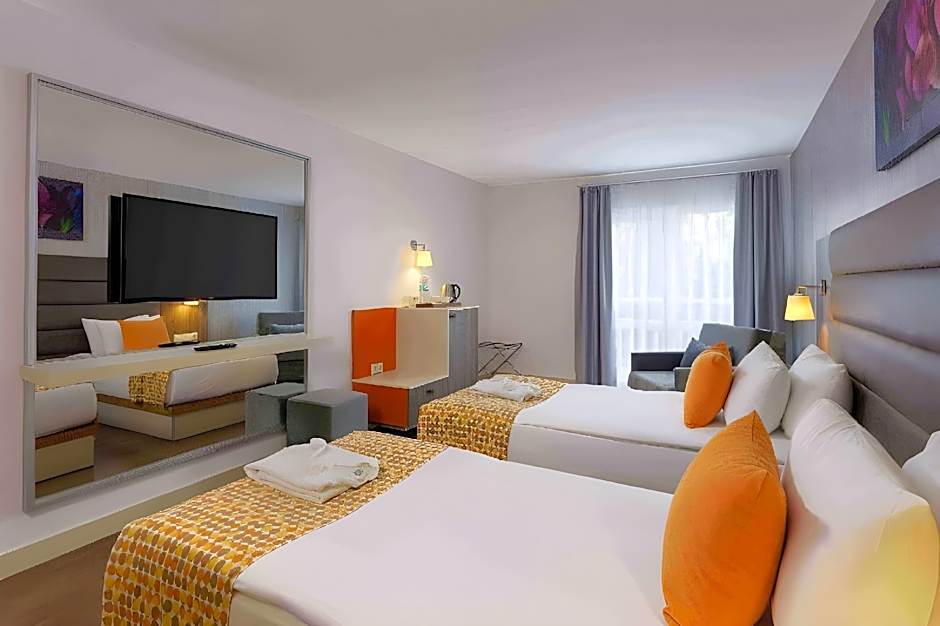 Seven Seas Hotel Blue - Ultra All Inclusive offers a variety of room types including Standard Triple, Double, and Family Rooms. Accommodations range from rooms for 2 adults and 1 child to rooms for 4 adults and 3 children, with varying bed configurations such as Double beds, Twin beds, and Sea or Pool views. Smoking is not allowed in any of the rooms available.
