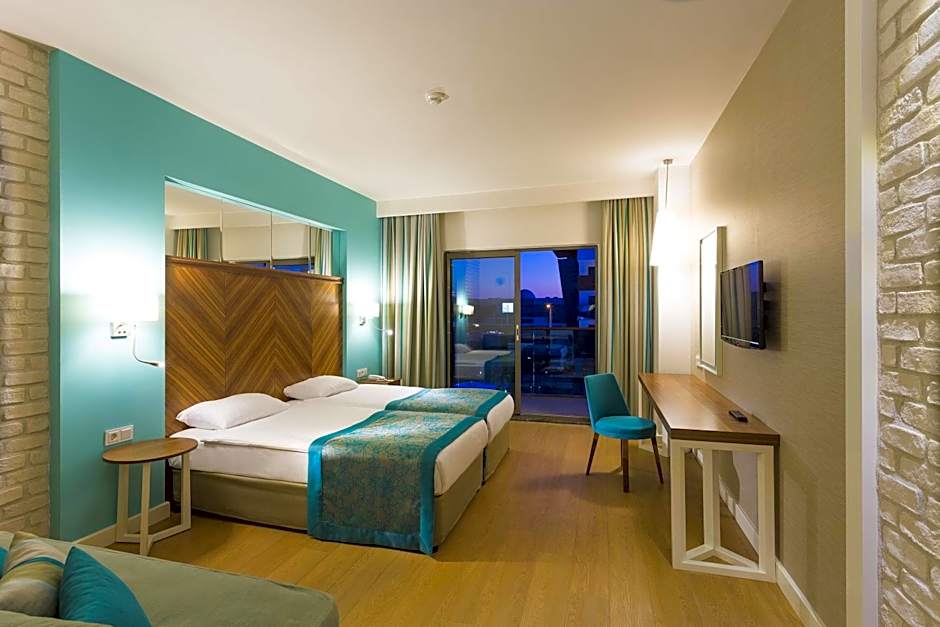 Guests at the Terrace Elite Resort Ultra All Inclusive can enjoy a variety of leisure amenities. They can spend time relaxing by the outdoor swimming pool or at the water park. Families with children can make use of the kids' pool. For those looking to pamper themselves, the hotel offers a spa with wellness packages and Turkish/steam bath facilities. Guests can also access the private beach area and take advantage of the beach umbrellas. Dining options include the RİVİERA, SULTAN, and TURKUAZ restaurants, serving a range of cuisines in different ambiences. With 24-hour front desk service and soundproof rooms, guests can fully unwind during their stay.