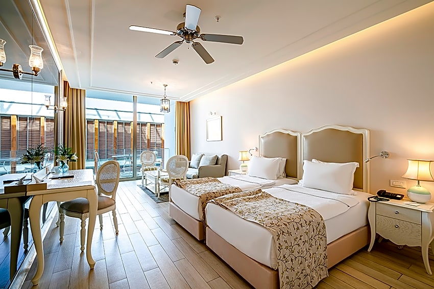DOUBLE SEA VIEW is 398 square feet and includes either a double bed 131-150 width or 2 single beds 80-130 width plus balcony, desk, satellite tv , hairdryer, tea and coffee making facilities , safe, bathrobes, and slippers.