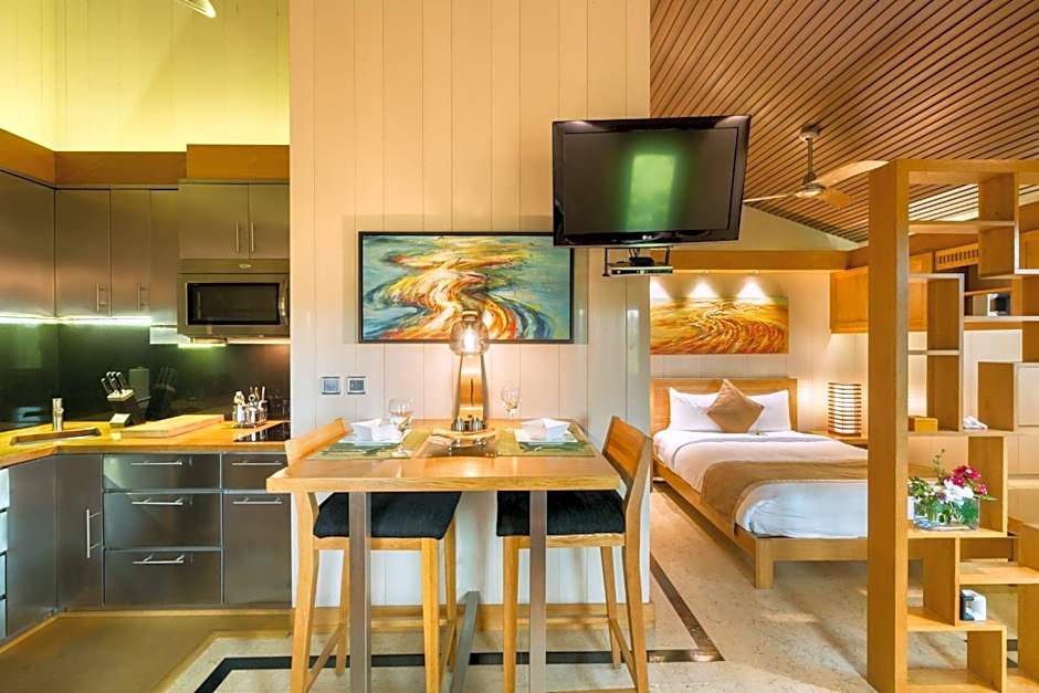 This deluxe ground-floor suite has a private entrance and a covered terrace with a BBQ upon request, overlooking the tropical organic gardens. Featuring high ceilings, marble floors and elegant contemporary décor, it offers a queen bedroom with pure cotton bed linen, a stylish bathroom and a spacious living-dining area with flat-screen TV. The fully equipped stainless steel kitchen includes an oven, microwave, coffee maker and fridge-freezer.