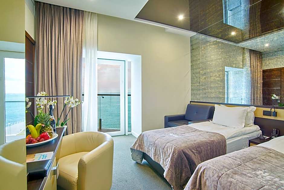 Room with a balcony. The panoramic windows of the room offer fantastic sea view. In the room: 1 double bed or 2 twin beds, folding sofa with a coffee table, wardrobe, desk and armchair, ironing station, TV 32" or 55". Bogner cosmetics, mineral water, tea and coffee set, and mini-sweets are provided free of charge daily.