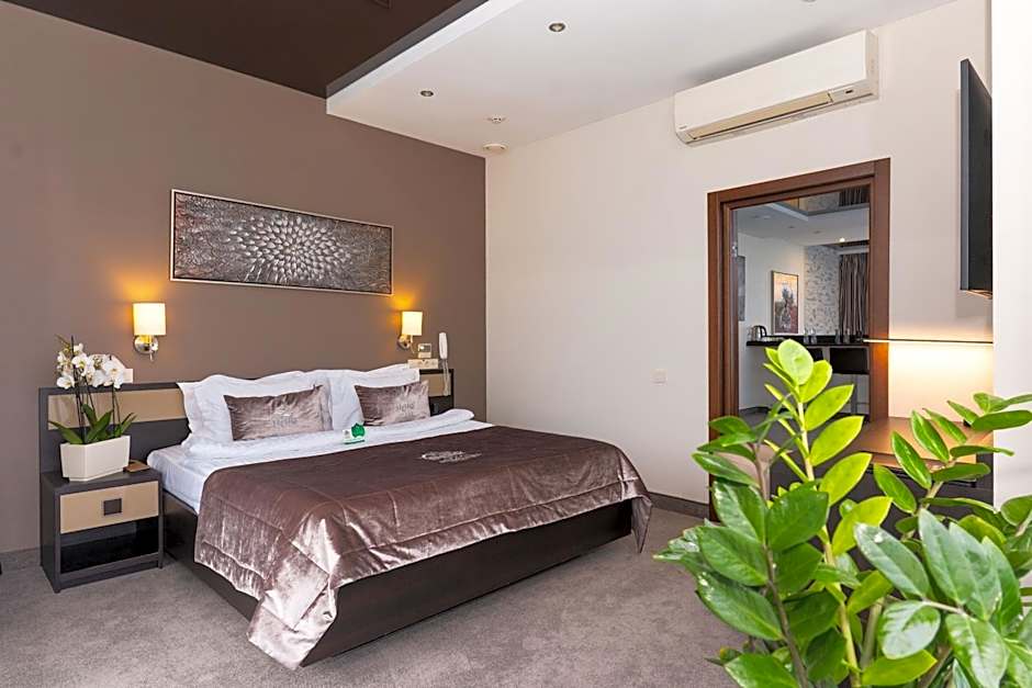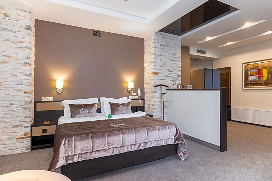 Two-room suite with 2 balconies and 2 toilets. The panoramic windows of the room offer parking view and casino. In the living room: double bed, jacuzzi, folding sofa with a coffee table, bar counter, wardrobe, desk and armchair, ironing station, smart TV 55". In the bedroom: double bed, smart TV 55". Chopard cosmetics, mineral water, tea and coffee set, and mini-sweets are provided free of charge daily. Complimentary on arrival 1 bottle of brut champagne Nemo Private label and chocolates.