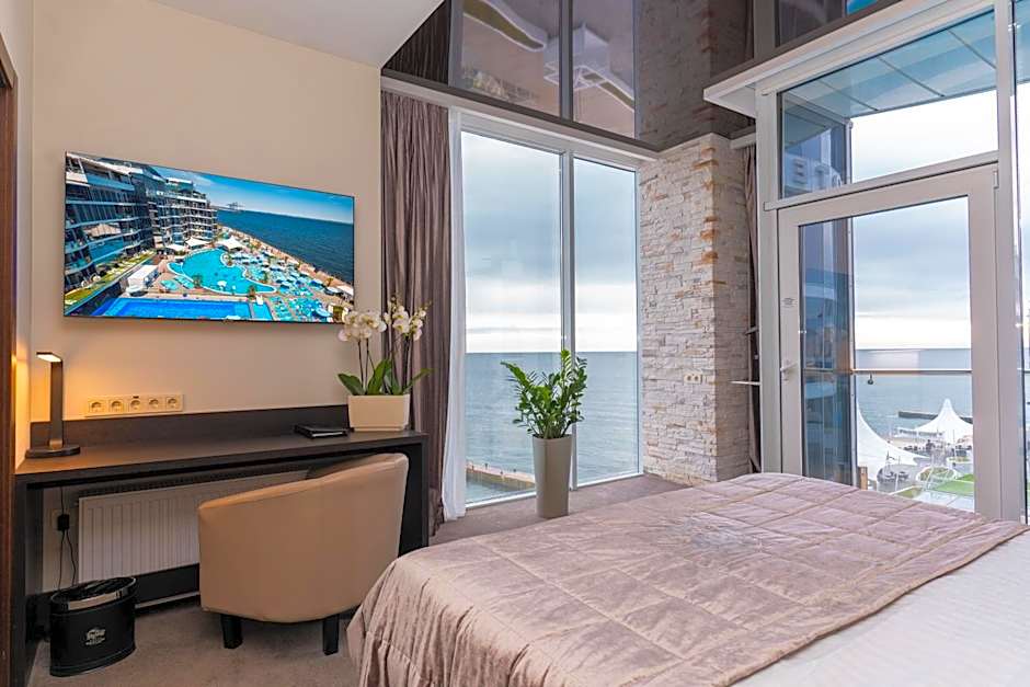 Spacious room with 1 or 2 balconies. The panoramic windows of the room offer direct or side sea views. In the room: double bed, jacuzzi by the window , folding sofa with a coffee table, bar counter, wardrobe, desk and armchair, ironing station, smart TV 55". Chopard cosmetics, mineral water, tea and coffee set, and mini-sweets are provided free of charge daily. Complimentary on arrival 1 bottle of brut champagne Nemo Private label and chocolates.