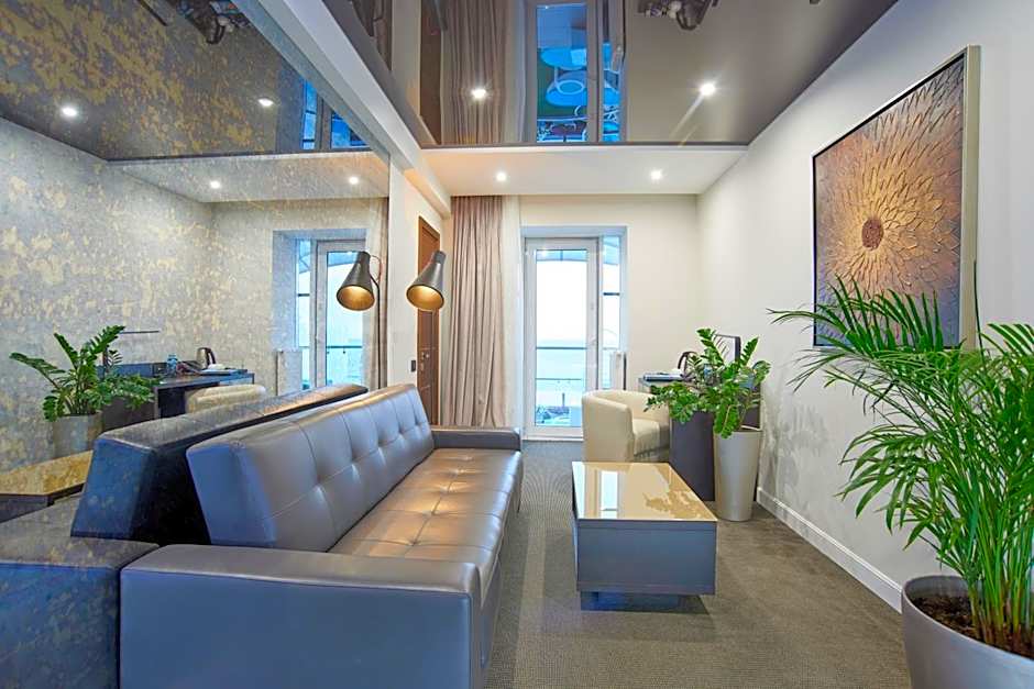 Two-room suite with a balcony. The panoramic windows of the room offer fantastic sea view. In the living room: folding sofa with a coffee table, bar counter, wardrobe, desk and armchair, ironing station, smart TV 55". In the bedroom: double bed, jacuzzi, smart TV 55". Chopard cosmetics, mineral water, tea and coffee set, and mini-sweets are provided free of charge daily. Complimentary on arrival 1 bottle of brut champagne Nemo Private label and chocolates.