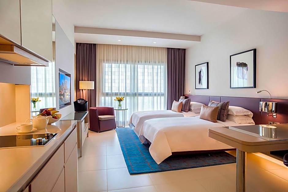 Indulge in a stylish 38sqm area with twin beds; the classic studio features a cozy living area with a convenient dining space, a working desk in addition to a fully equipped kitchenette with hot plate, microwave, oven, refrigerator and washing machine.