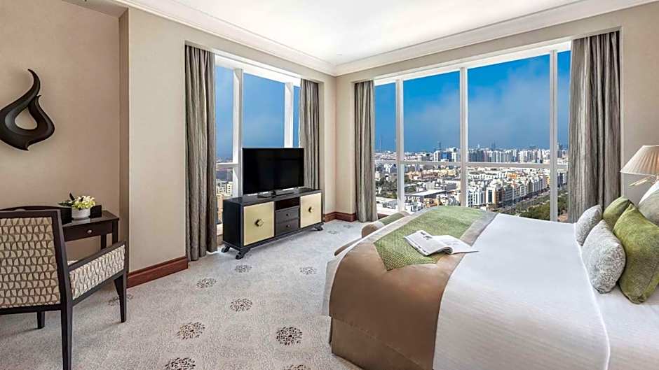 The room offers a separate and spacious living room, adjoining the bedroom. Featuring floor-to-ceiling windows with city view, this elegant room includes warm color schemes. It has a spacious desk, a flat-screen TV and a mini-bar. Added amenities are DVD player, an electric teakettle and an iPod docking station. The bathroom has a separate walk-in shower and a bathtub.
