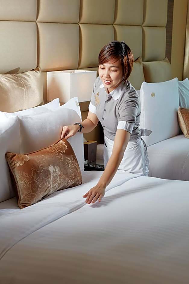 The hotel offers different types of rooms including Premium Rooms, Deluxe Twin Rooms, Deluxe King Rooms, and various suites such as Royal Suite, Junior Suite, One-Bedroom Suite, and Penthouse Suite. Most rooms do not allow smoking and offer either double or twin beds, with room sizes ranging from 344 sqft to 2293 sqft. The accommodations can cater to 2 to 6 adults and 0 to 1 children, offering various bed configurations to suit different guest needs.