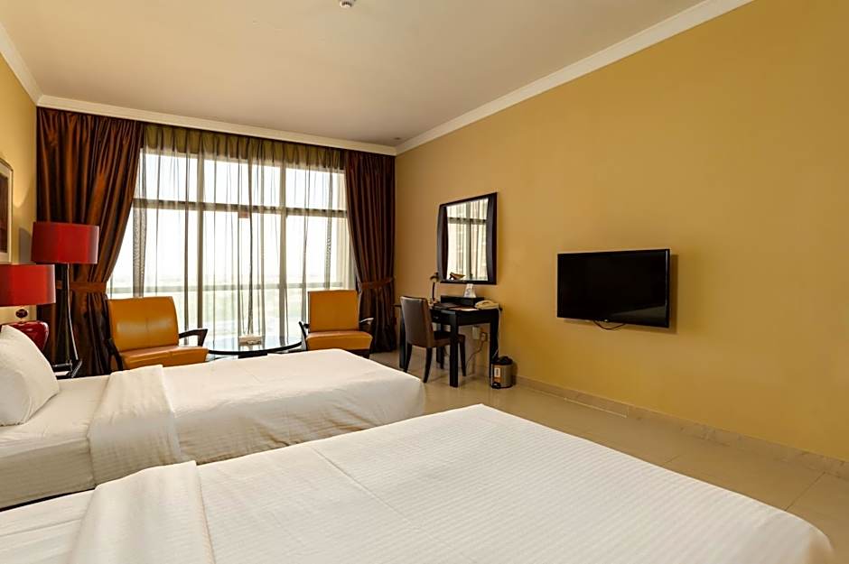 The Oryx Hotel offers a variety of rooms including Deluxe King Suites with a room size of 581 sqft and a Queen size bed, Deluxe Twin Rooms with a room size of 388 sqft and a Double bed plus two Twin beds, and Deluxe King Rooms with a room size of 388 sqft and a Queen size bed. These rooms can accommodate 2 adults, and do not permit smoking.