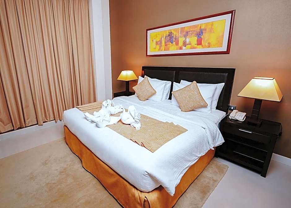 Spacious suite offering an open-plan living and dining area. Includes a luxury bathroom with bath tub.