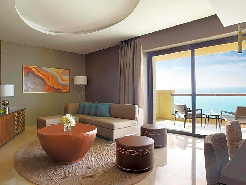 This air-conditioned offers a spacious 76 square yards of elegant space with separate living room and a private balcony offering uninterrupted view of the sea. This stylish suite features plush furnishings with a separate desk, high speed Internet connection at a surcharge, a flat screen HD TV and media panel. The bathroom comes with separate rain shower and a detached bathtub.