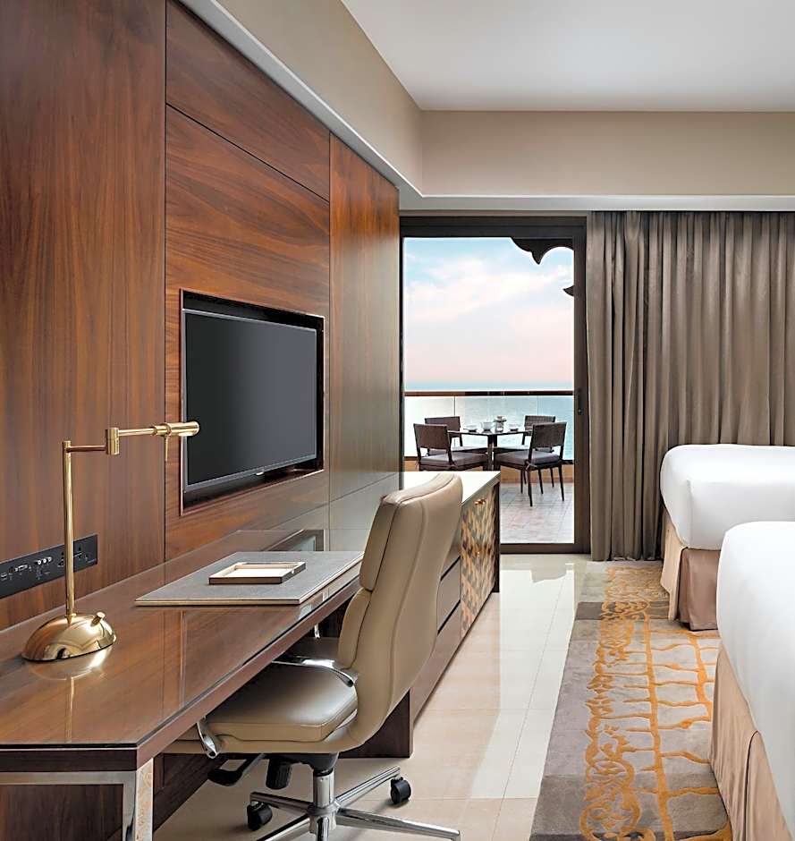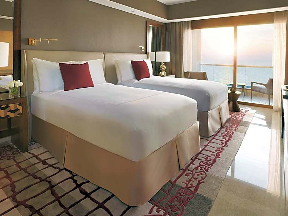 Fairmont Ajman offers a variety of rooms including Signature Twin Rooms, Junior Suites, Standard King Rooms, Family Rooms, Deluxe Twin Rooms, Two-Bedroom Suites, and Penthouse Suites. The rooms accommodate between 2 to 6 adults and 2 to 7 children. All rooms are non-smoking and contain either twin, king, queen or double beds. Room sizes range from 43 sqft to 517 sqft, with sea view options available.