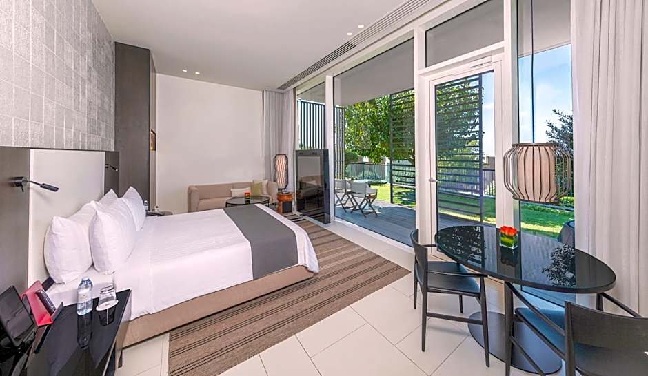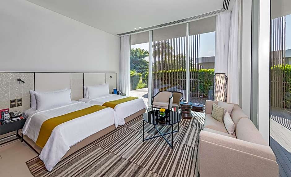 The hotel offers various room types including Twin and Quadruple rooms, as well as Suites, with sizes ranging from 872 sqft to 1173 sqft. All rooms are non-smoking and accommodate 2 adults and 2 children. Bed sizes include Twin and King, with some rooms featuring private gardens or terraces.