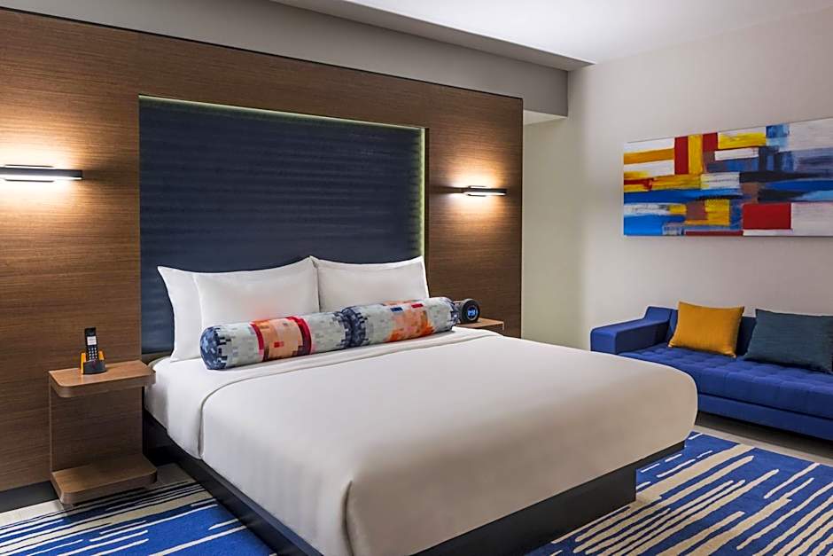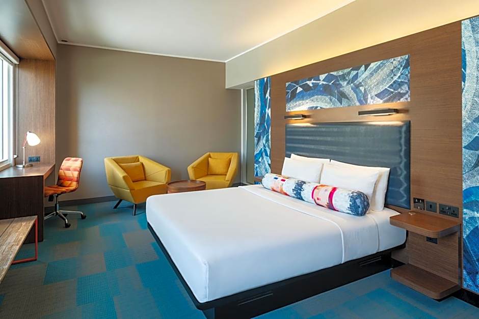 The hotel offers a variety of room types including Aloft Rooms with 1 King or 2 Queen beds, accommodating up to 2 adults and 1 child, as well as Aloft Suites with 1 King bed, accommodating up to 3 adults and 2 children. All rooms are non-smoking and range in size from 344 sqft to 549 sqft.