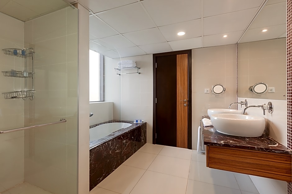 This double room combines a King and a Twin Room, with a guaranteed connecting door. Each room features a sitting area, floor to ceiling windows, air conditioning, free bottled water, and free Wi-Fi. Two private bathrooms with a shower/bathtub combination are complemented by upscale bath amenities.