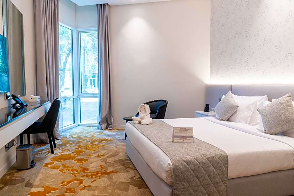 The hotel is located inside the Etisalat academy It is 10mn drive from the airport. The rooms are clean and spacious enough Everything is modern . They have a full sport complex with squash Babington, basket ball indoor jacczzi and sauna a huge gym and a beautiful outdoor shaded pool The whole is located in a kind of park .surrounded by trees. So quite we can hear the birds singing . The staff at reception is absolutely wonderful They hired a new Morrocan chef who is very kind ...he promised to prepare amazing food ..cannot wait to go back!!