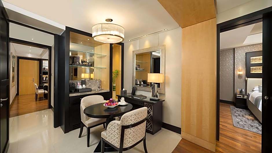 Executive Grand Deluxe room have access to the Executive Lounge and includes Breakfast. They are highlighted by a perfect blend of modern contemporary décor and distinctive Arabian design that offer guests a generous space and comfort environment with a separate dining, study and living room area. Guests can enjoy the latest blockbusters on the two 46-inch TV screen and feast on delights from the in-room dining menu. A beautiful and large, fully marbled bathroom with luxurious bath amenities, deep soaking tub and a separate walk-in shower with a rain forest shower head confer an ambiance of luxurious exclusivity, enhanced by a wealth of special in-room amenities.