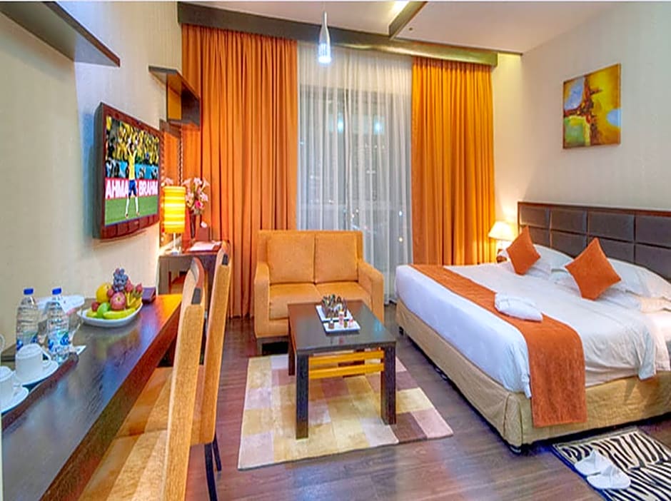 Deluxe Studio Room is 355 square feet and includes a king-size bed 150-183 width.