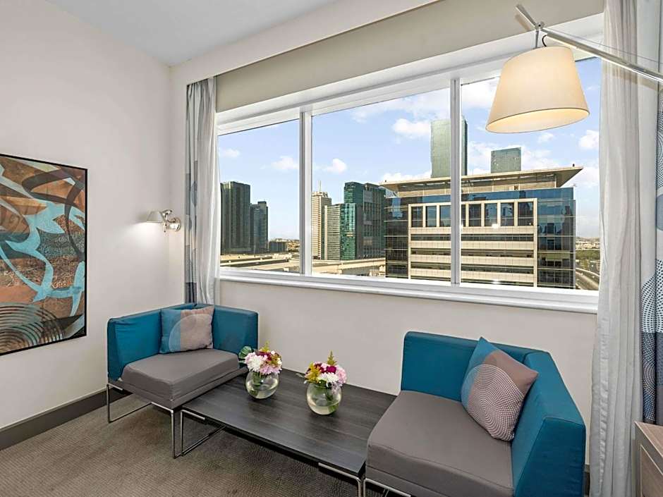 The elegant corner Suites has its own separate and spacious living area, dining area, bedroom with attached bathroom, and a guest bathroom. The Suites offer great city views.