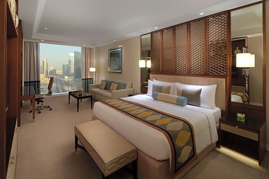 GRAND LUXURY - BURJ VIEW KING BED is 1668 square feet and includes a king-size bed 150-183 width plus living room, extra beds on demand, desk, cable tv, hairdryer, tea and coffee making facilities , ironing set, safe, bathrobes, and slippers.