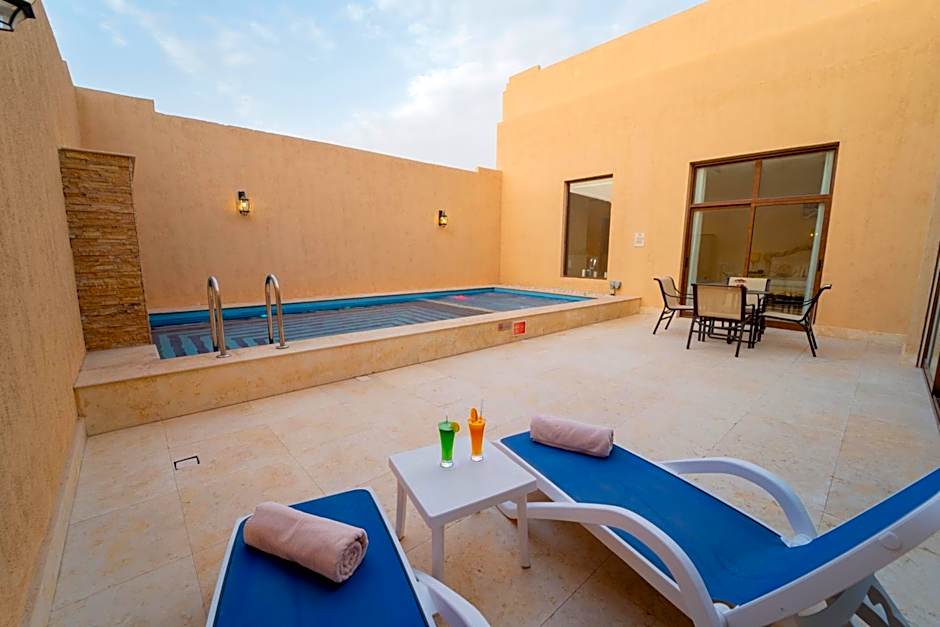 This villa features a private entrance with 3 bedrooms, each with a King sized bed, The living area has seating area with a sofa and a satellite flat screen TV.