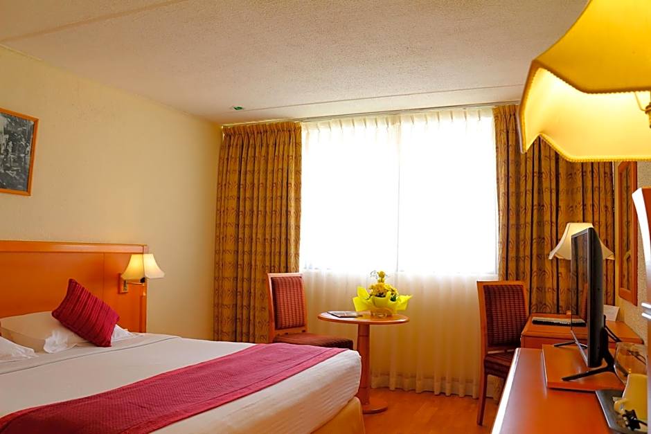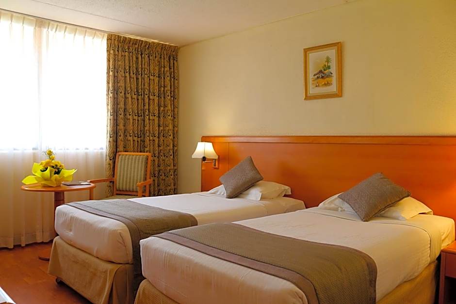 The hotel offers City View rooms, accommodating 2 adults and 1 child, with non-smoking policy and a mix of twin and queen size beds. The room size is 248 sqft.