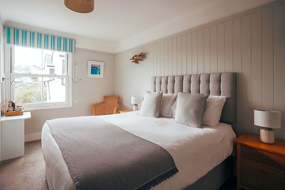 The hotel is ideally placed for wonderful views over the bay and harbour, with a short walk down to the beach or along the lane to the harbour and shops. The hotel restaurant was amazing; breakfast and evening meals were like a breath of fresh air in themselves - so good!! You just want nice, properly done food sometimes on holiday - they get it! And a table in the bay window overlooking the terrace and lawn, above the cove? Yes, please! The staff were a warm, considerate presence, ready to answer questions and offer a few hints and observations, blending their professional role with the friendly ease of a well-liked neighbour. A homely lounge that comes into its own late in the evening - settle in with the sea and harbour in view, and bookshelves, and warm drinks or something from the bar to relax with. Did that. Perfect.