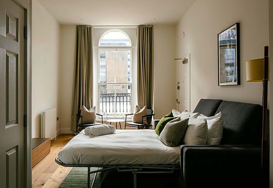 Four apartment styles deliver flexible Edinburgh stays. The Apartment, 2 Bedroom covers 807 sq ft and accommodates 2 adults and 1 child, with two Queen beds. The Deluxe Apartment, 1 Bedroom spans 570 sq ft and includes one Sofa Bed and one Queen bed for 2 adults and 1 child. The Studio offers 431 sq ft with a Queen bed for 2 adults and 1 child. The Apartment, 1 Bedroom is 592 sq ft with one Queen bed for 2 adults and 1 child. All units are non-smoking.