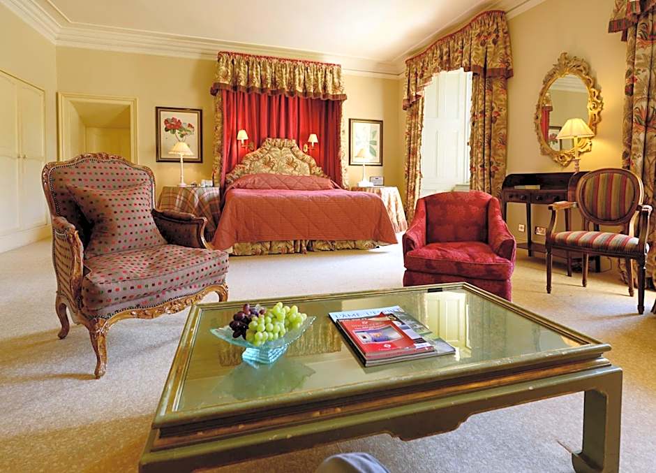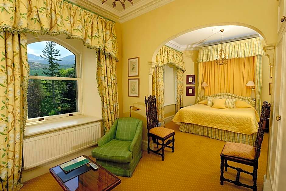 Junior Suite with views over the castle gardens, the small loch, and the surrounding mountains, this spacious room is located on the first floor and features a separate sitting area. The bathroom has a separate bath and shower, along with a large window with a view over the loch and mountains.