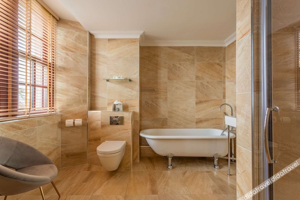 The spacious suite features private bathroom equipped with a bath and a shower.