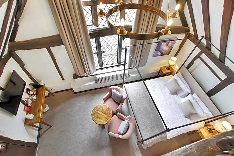 A modern bathroom is on the ground floor while the bedroom area is located on the first floor with beams and wonderful Tudor features stretching across the high ceiling.