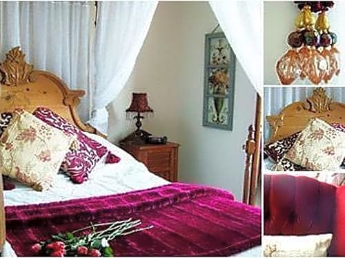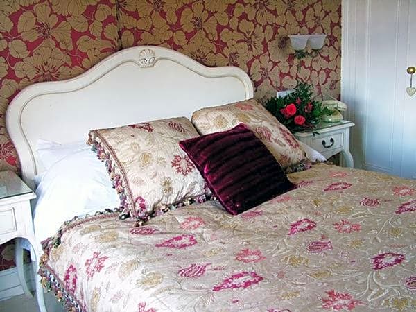 This four poster room has been decorated with a white four-poster bed and brightly painted pink walls on 3 sides, with feature wall paper on other side.