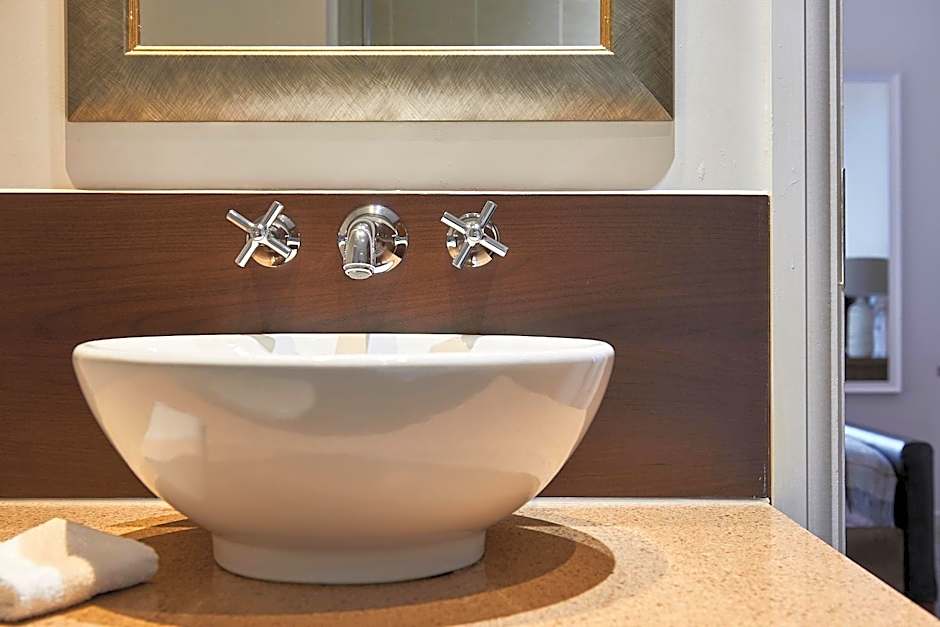 The Suite is decorated in neutral tones and splashes of color, and includes a comfy chair with workspace, a fully equipped kitchen, a flat-screen TV, and free internet access.