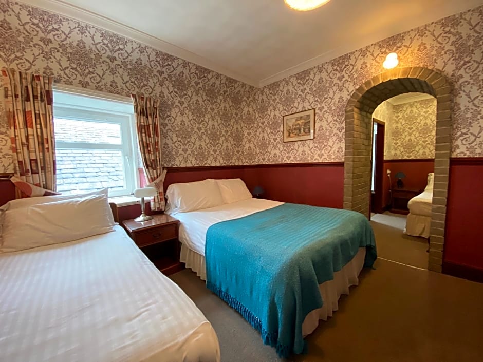 The Kings Arms Hotel offers a variety of rooms including Single Rooms for single occupancy with a twin bed and no smoking allowed; Double Rooms with private bathrooms for 2 adults with a double bed and no smoking allowed; Family Rooms for 4 adults with a twin bed, double bed, and bunk bed, and no smoking allowed; and Triple Rooms for 3 adults with a twin bed, double bed, and no smoking allowed. Room sizes range from 129 sqft to 269 sqft.